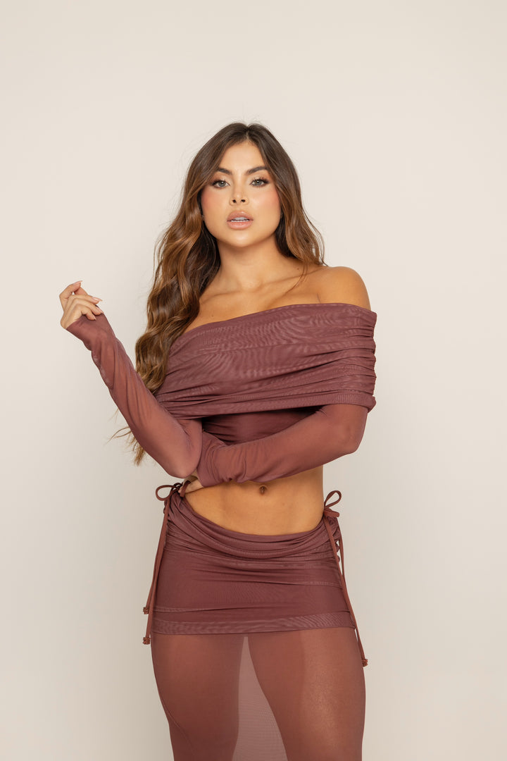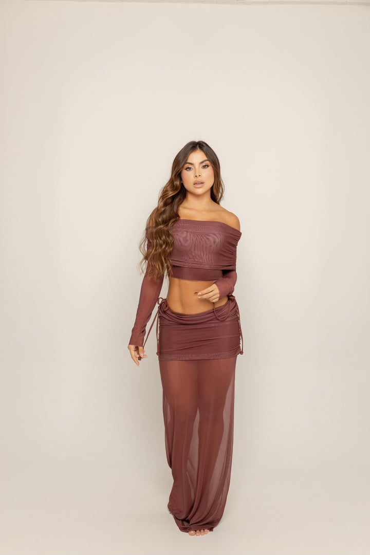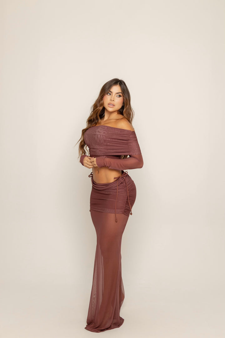 Confeccionado en malla translúcida, su top off-shoulder equilibra suavidad y fuerza, mientras la falda larga con recogidos laterales crea un efecto fluido y envolvente que se mueve con cada paso.